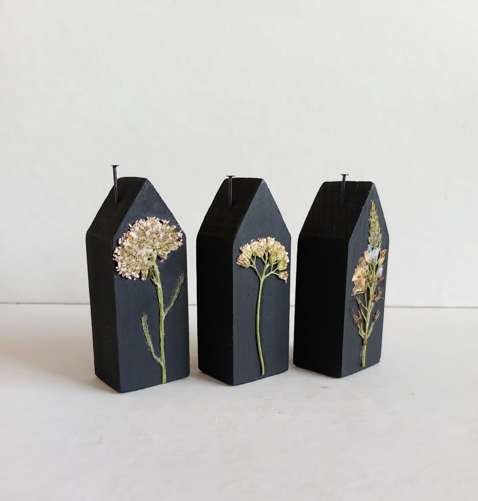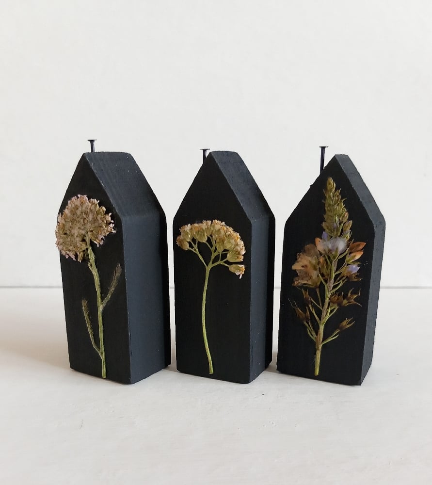Set of 3 miniature black wooden houses with pressed wildflowers.